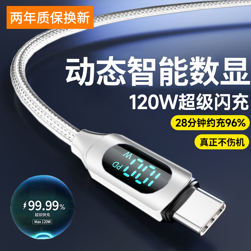 手机快充电线typec数显功率数据线120W超级闪充适用华为荣耀魅族vivooppo小米iPhone15/16pro平板汽车通用2米