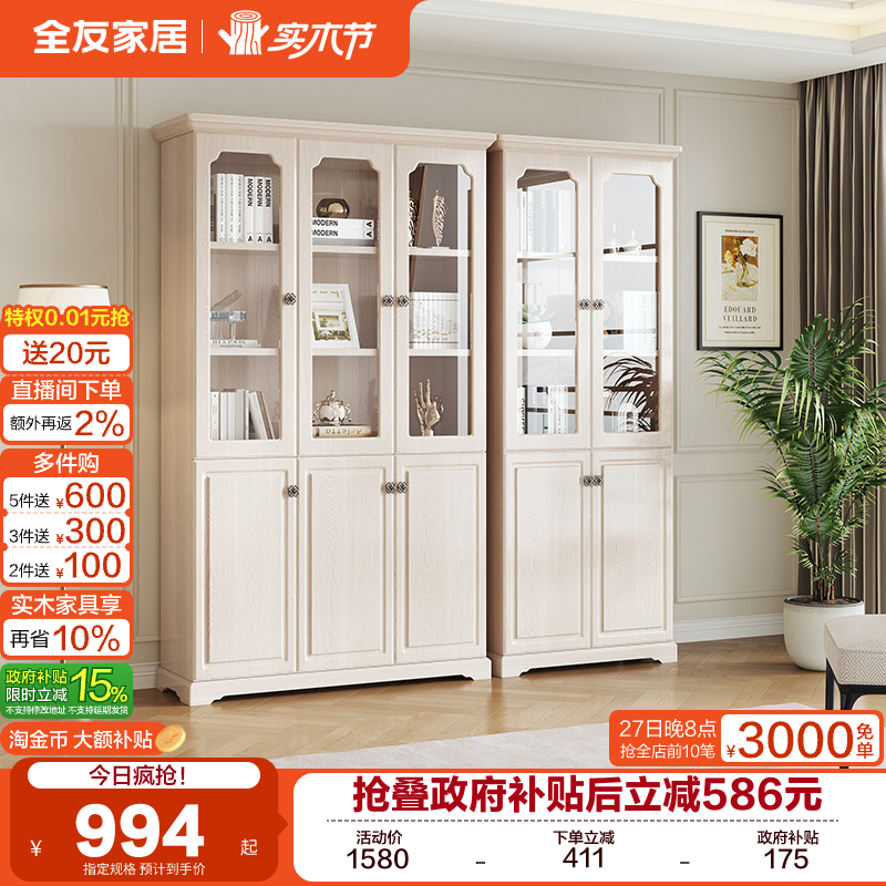 实木书柜置物柜家用收纳窄立柜储物柜客厅美式书架带玻璃门展示柜