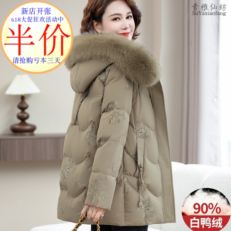 雅鹿妈妈羽绒服中长款2025冬季新款刺绣休闲中老年立领保暖外套女