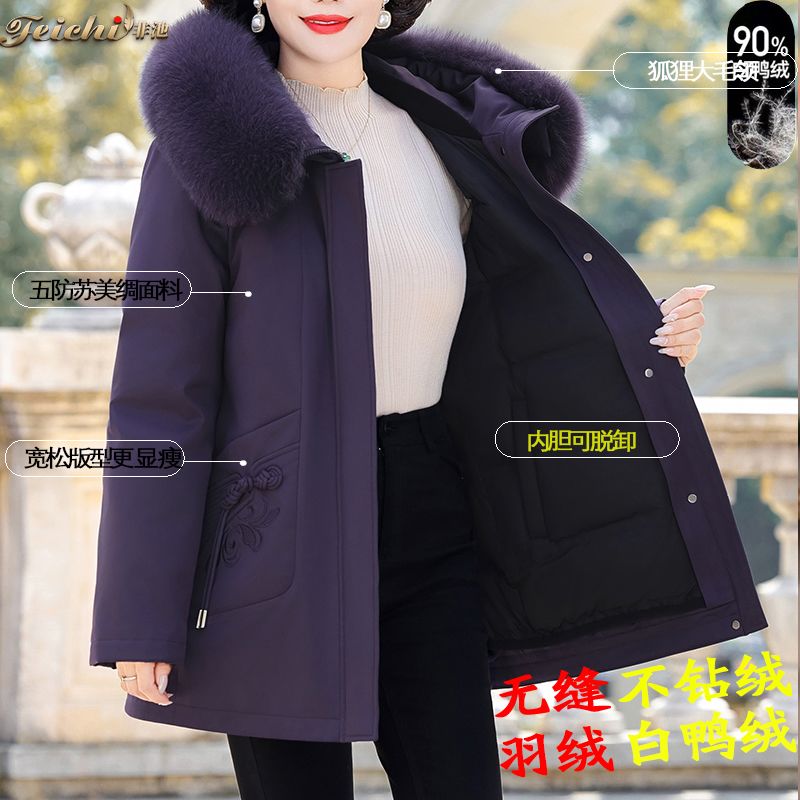齐黛品牌妈妈羽绒服中长款2025冬季新款毛领加厚洋气减龄保暖外套