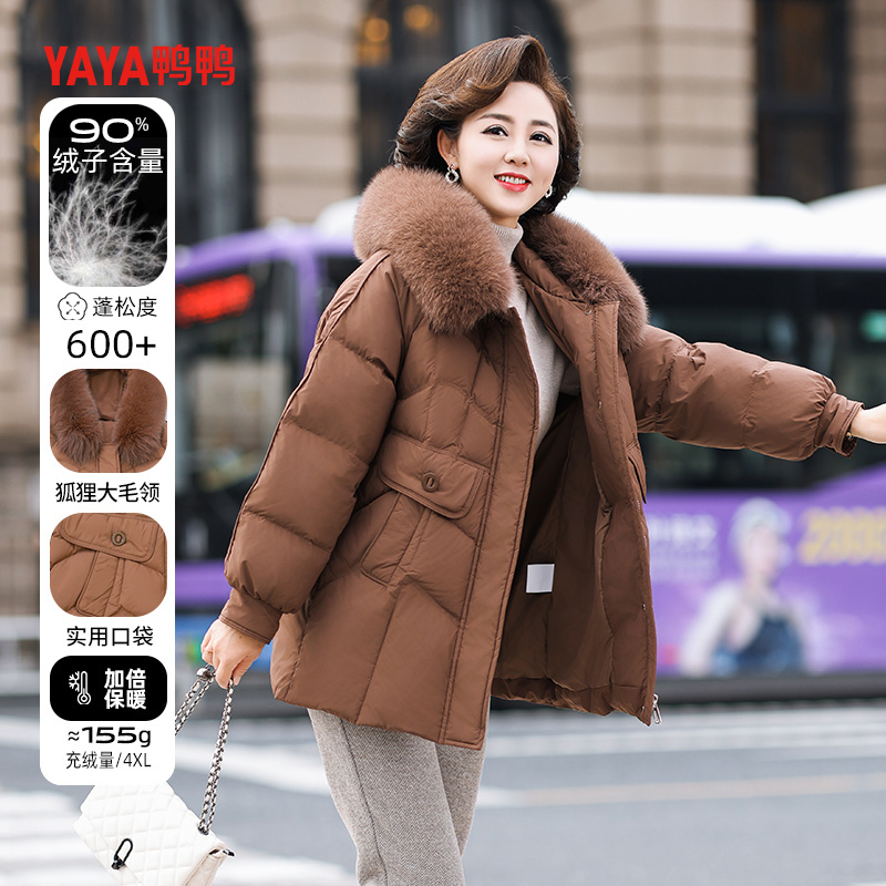 雅鹿狐狸大毛领妈妈羽绒服中长款2025冬季新款中老年宽松保暖外套