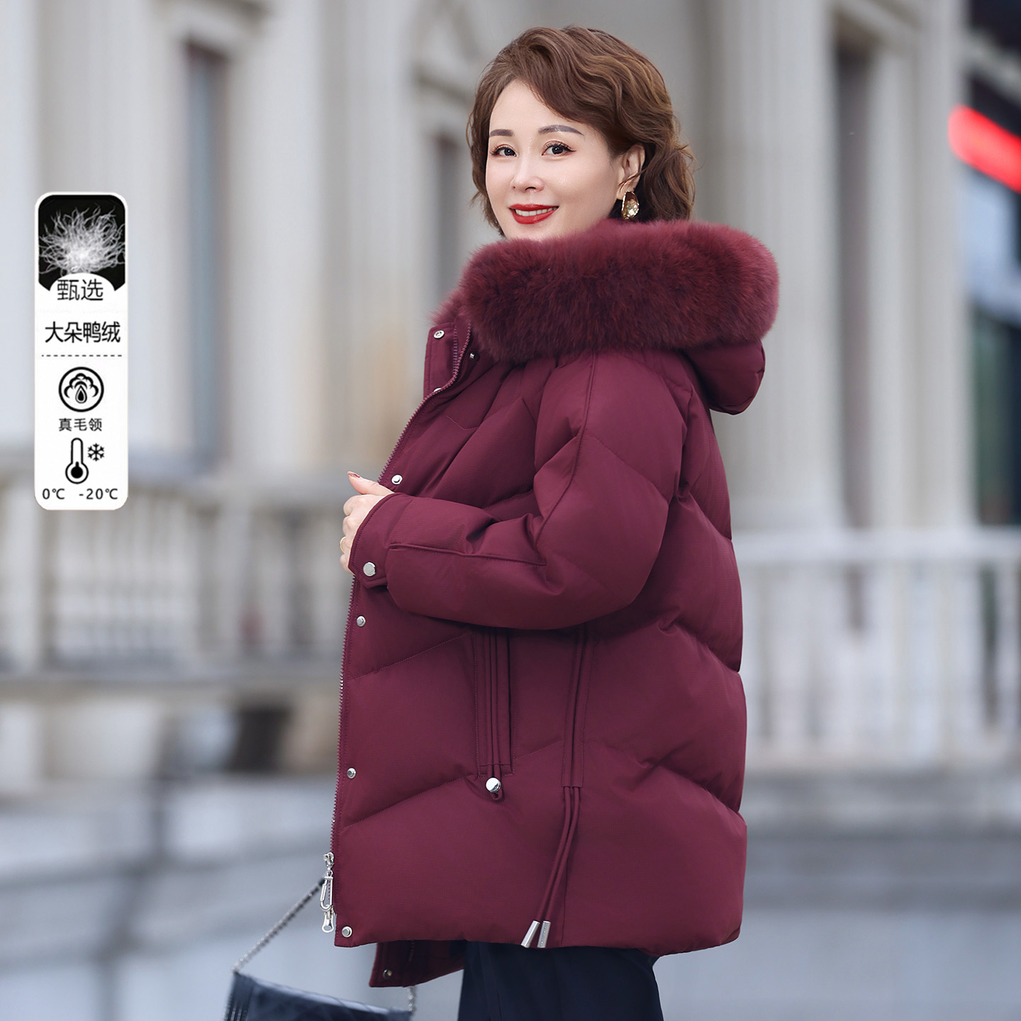 鸭鸭妈妈羽绒服中长款狐狸毛领连帽棉服中年女外套中老年保暖冬装
