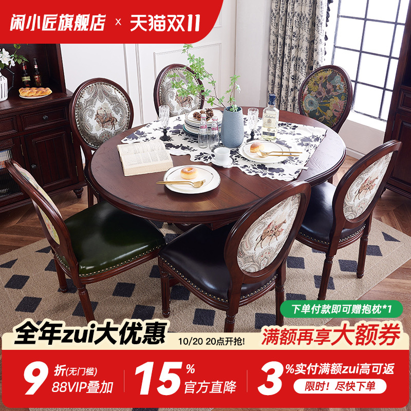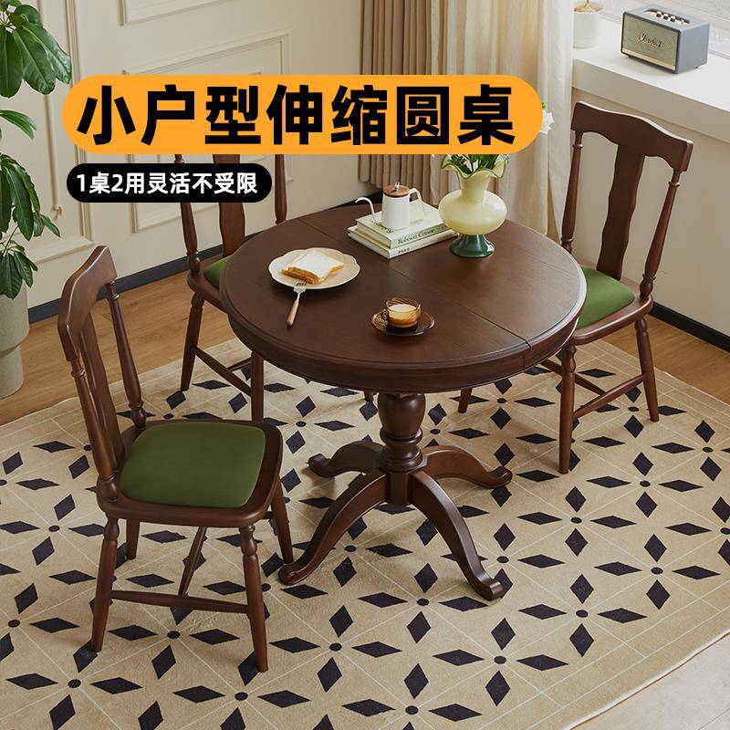 法式实木可伸缩餐桌椅组合家用小户型复古风方变圆两用折叠圆饭桌