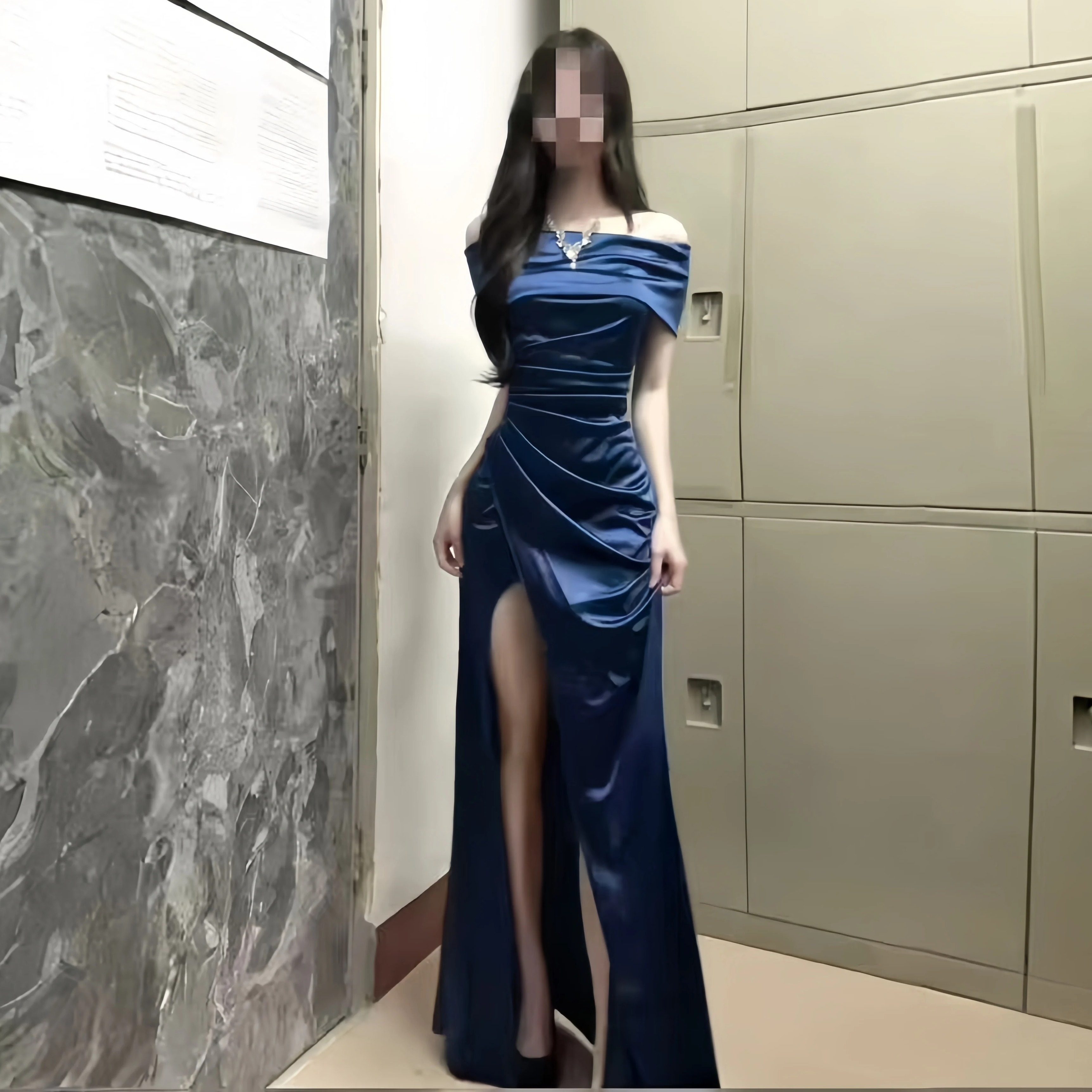小可wiwi法式一字肩缎面连衣裙女年会宴会成人礼走秀开叉晚礼服裙