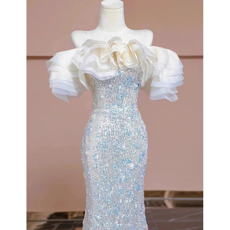 亮片晚礼服裙高端轻奢小众一字肩主持人年会连衣裙鱼尾高级感艺考