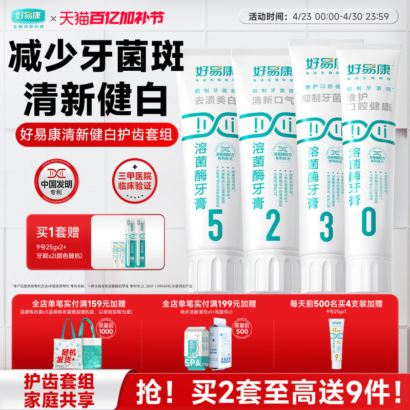 好易康溶菌酶牙膏亮白牙齿清新口气去黄护龈减轻异味口臭大家庭装