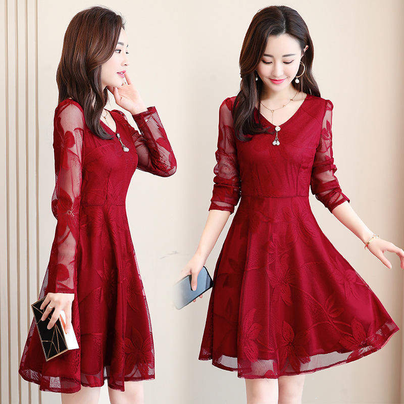 新款连衣裙女2024新品a字裙雷丝拼接流行涤纶气质修身显瘦韩版 长