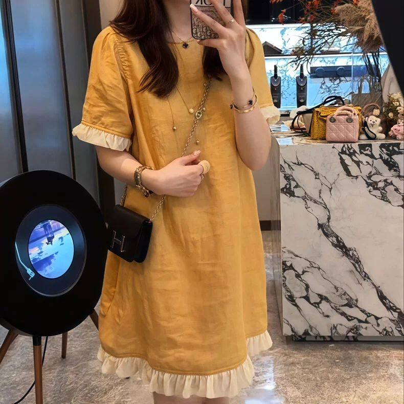 胖MM大码300斤韩系拼接雷丝边T恤裙夏季宽松遮肉显瘦中长款连衣裙