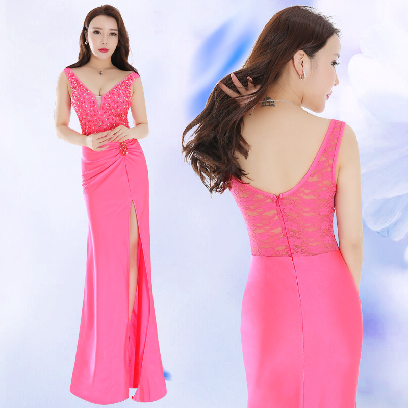 夜场晚礼服新款性感雷丝深V开叉连衣裙长裙镶钻KTV公主包臀裙