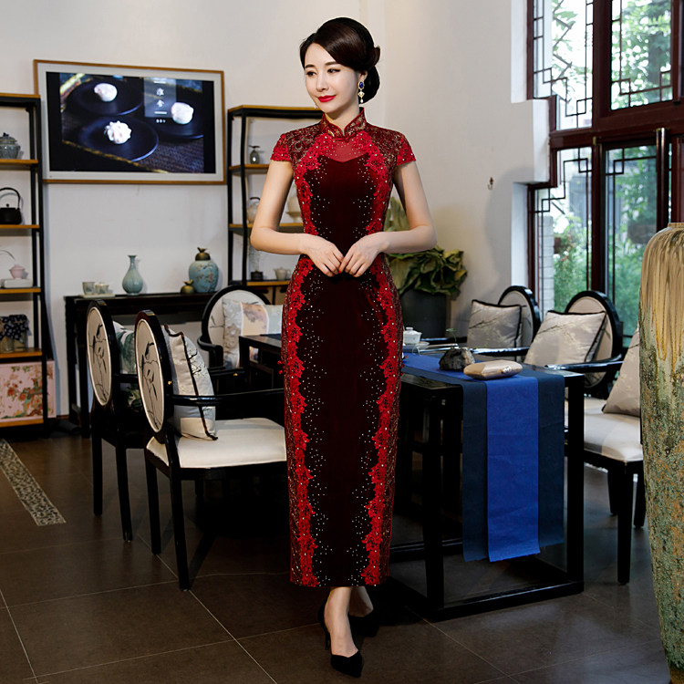 修身显瘦性感深V开叉雷丝旗袍连衣裙2024新款夏改良透明晚礼服女