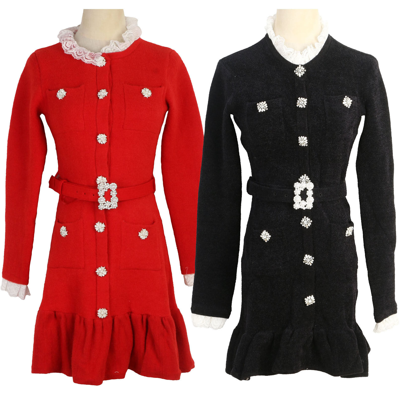 maSande秋冬新款女装小香风千金风长裙连衣裙女雷丝领修身气质法