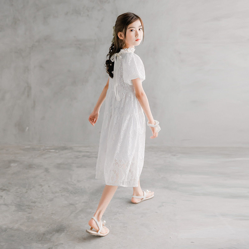 女童公主裙夏季2023新款儿童韩版洋气一字领雷丝连衣裙珍珠蕾丝裙