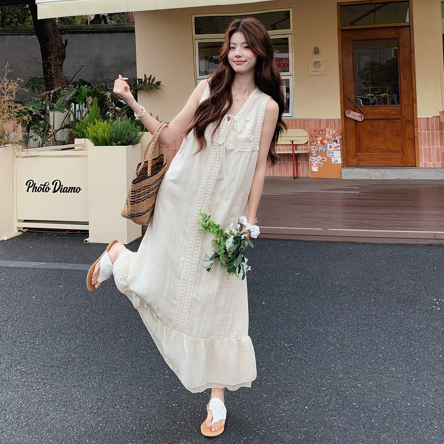 法式复古浪漫度假风无袖连衣裙女夏2026新款雷丝花边V领背心长裙