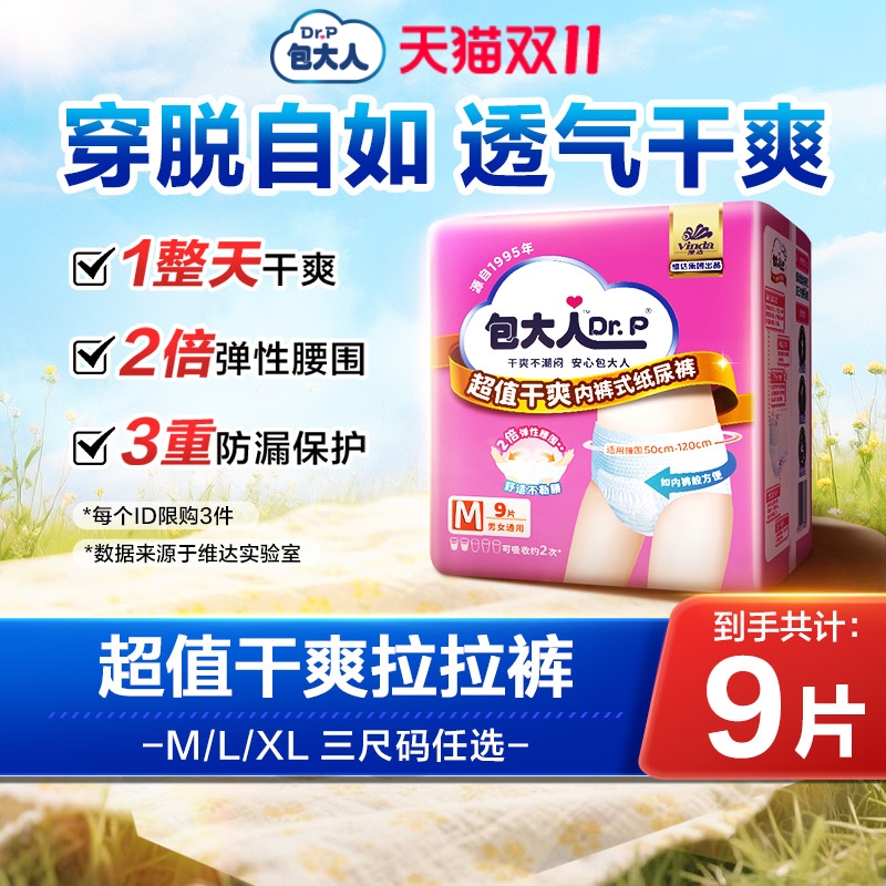 包大人夜用型成人纸尿裤XL码9片加大老人用成人尿不湿孕产妇男女