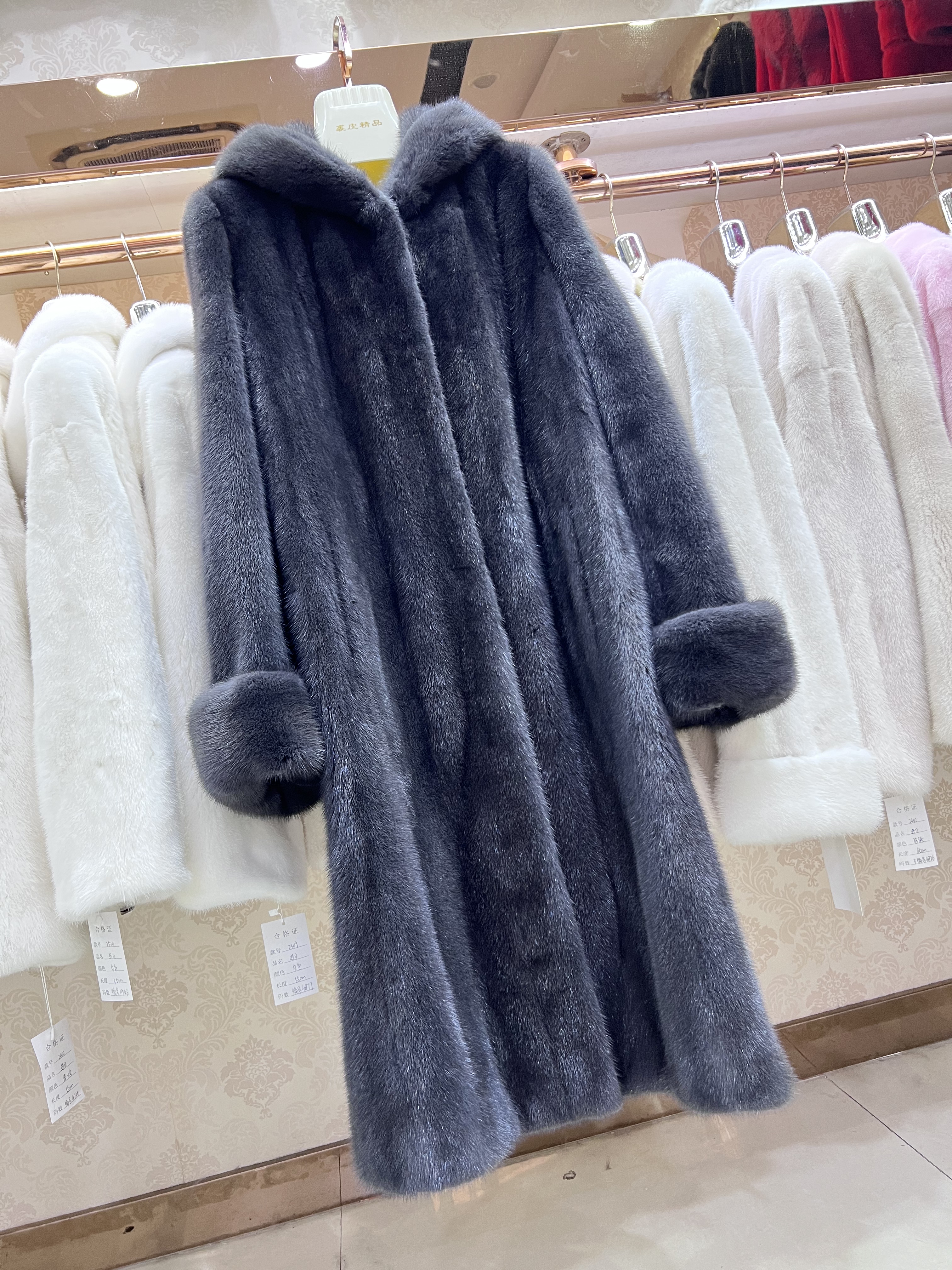 110CM长款进口貂皮大衣女整貂连带帽水貂皮草外套挽袖2025新款