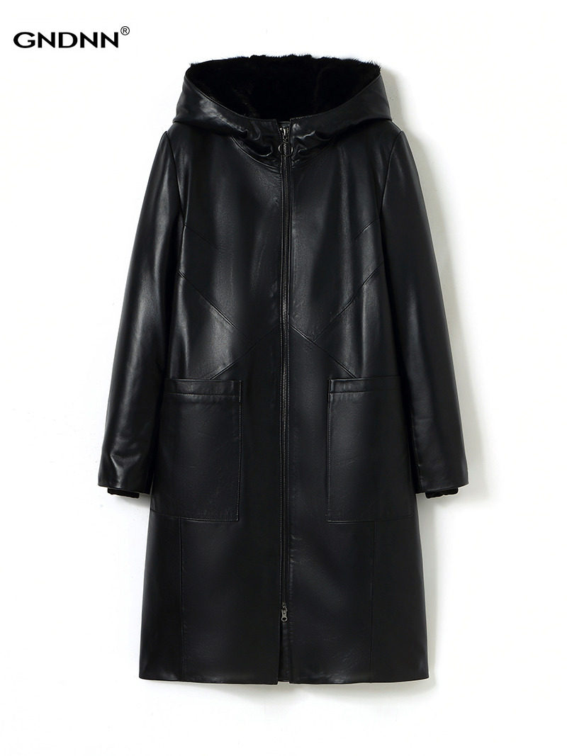 加肥大码真皮皮衣女长款皮毛一体水貂内胆带帽大衣皮草外套胖妈妈