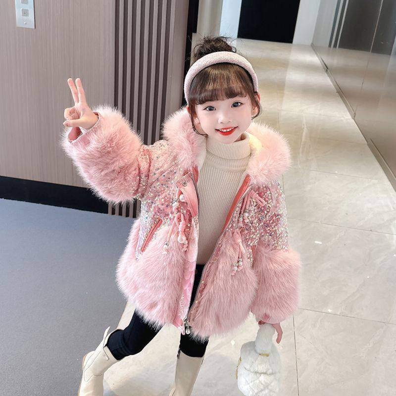 2025冬季男童女童仿皮草水貂外套儿童中长款带帽宝宝棉服加厚大衣
