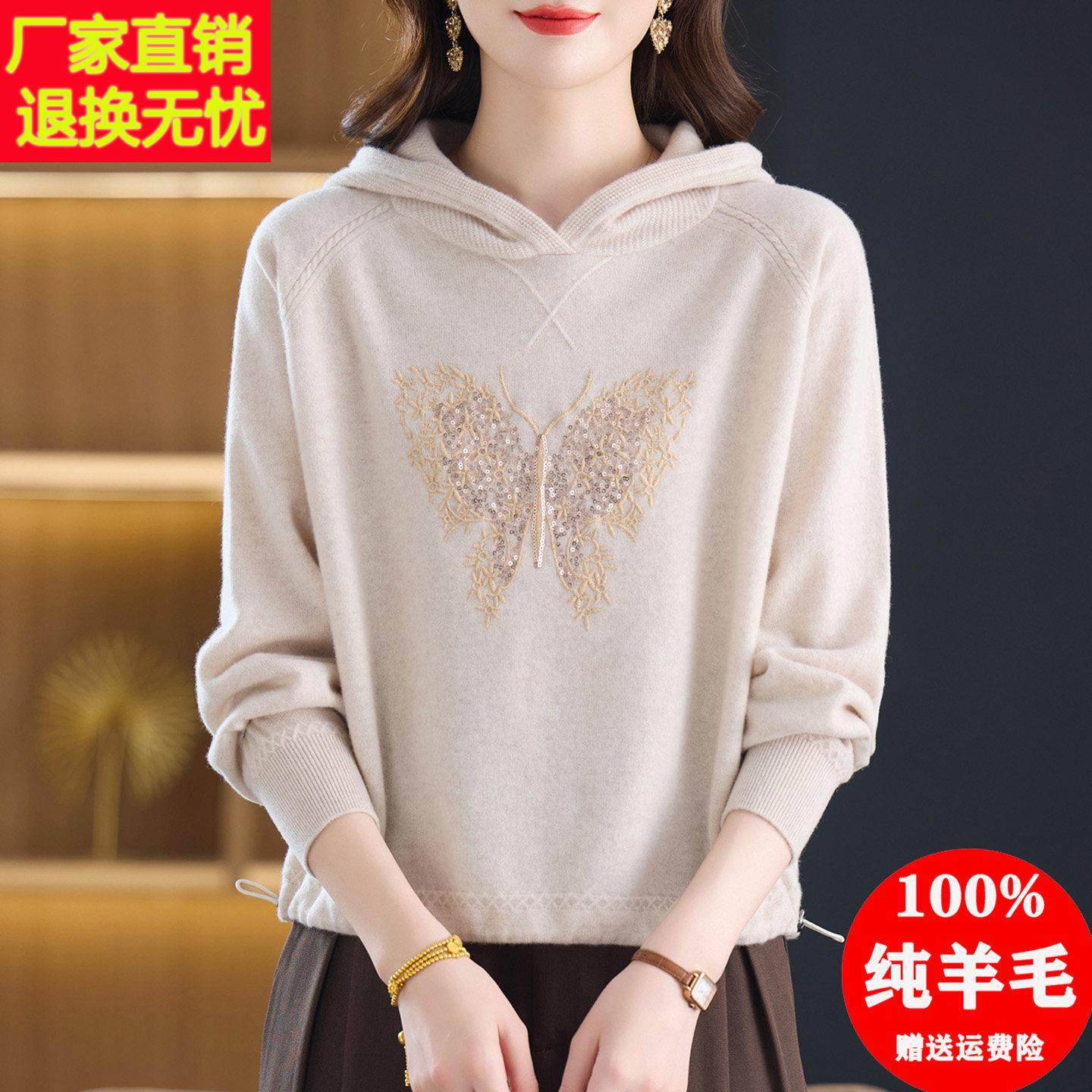 时尚带帽毛衣女秋冬100纯羊毛衫卫衣套头连帽针织衫宽松外穿上衣