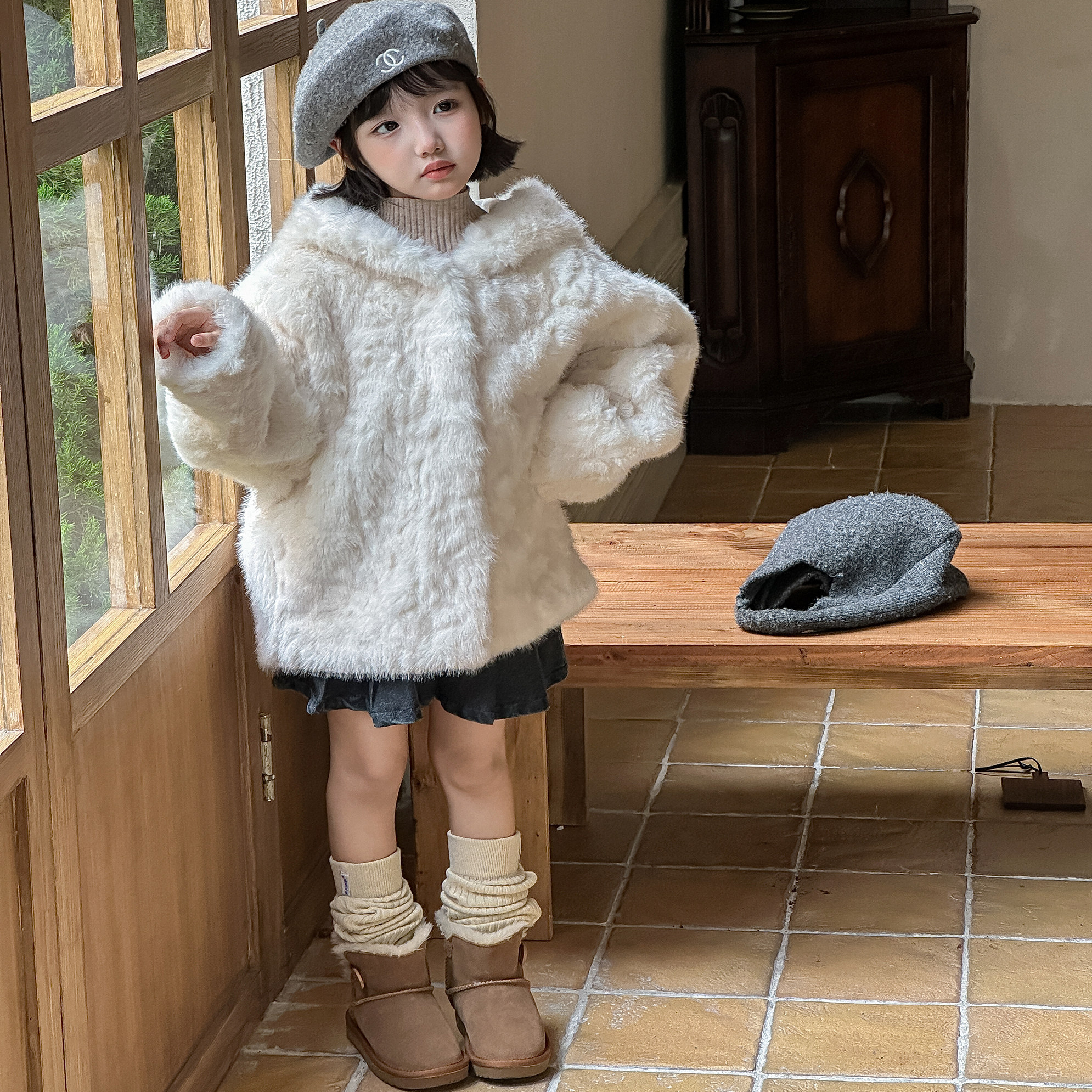 若堇2025冬季新款环保毛一体带帽中长款女童皮草外套软糯毛毛