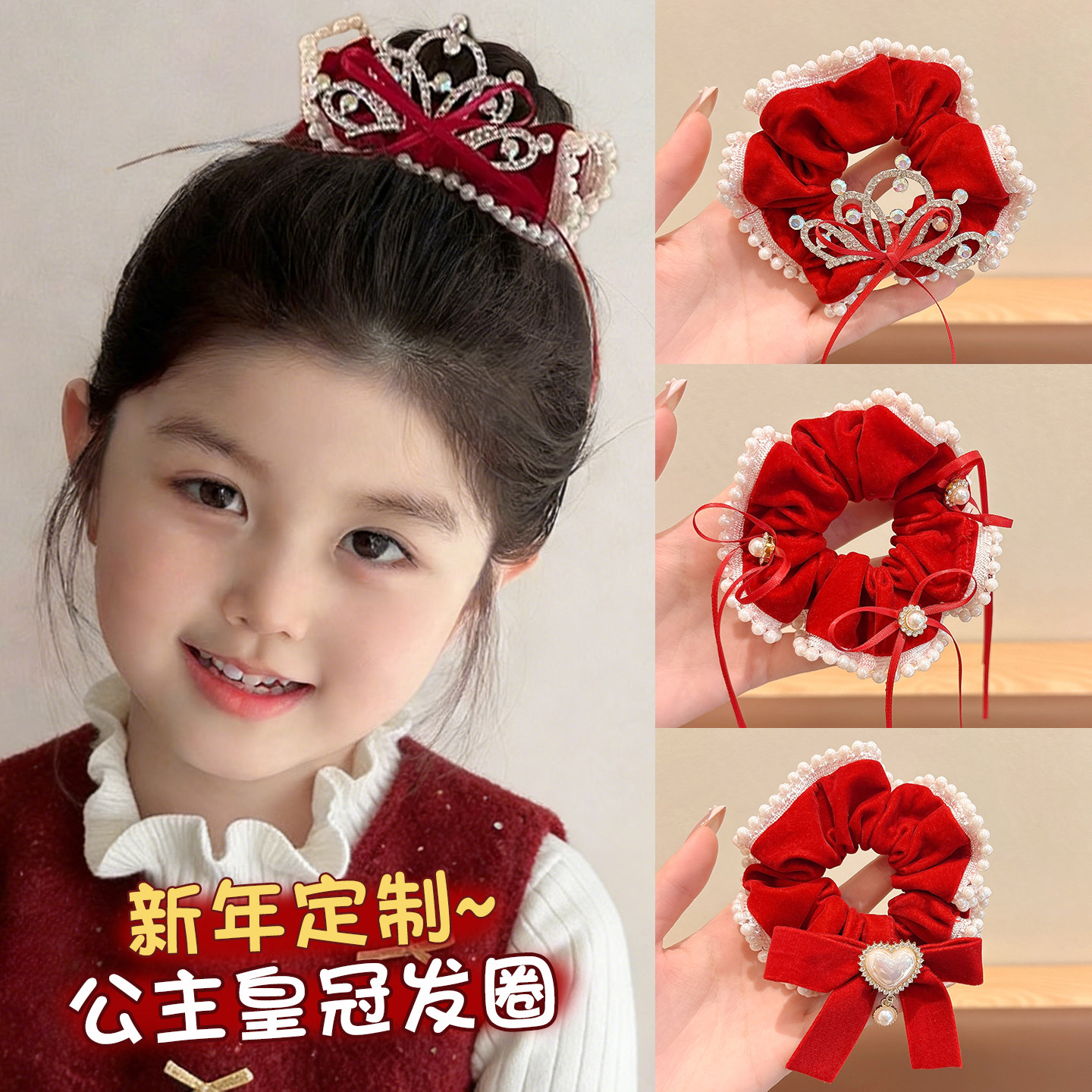 儿童新年公主皇冠头饰女童红色大肠发圈宝宝过年头绳扎丸子头皮筋