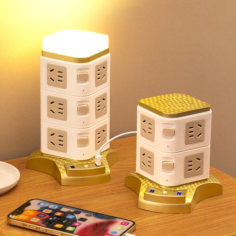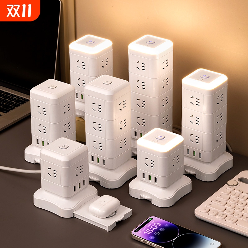 新款立式多功能插座带USB小夜灯塔形拖线板家用办公插板多孔排插