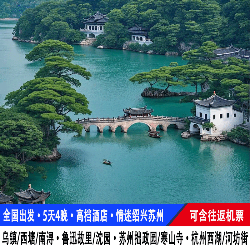 飞机杭州旅游5天4晚苏州拙政园寒山寺绍兴鲁迅故里乌镇西湖跟团游