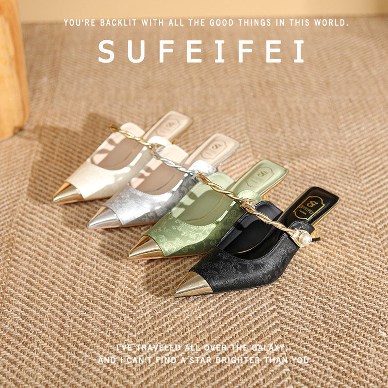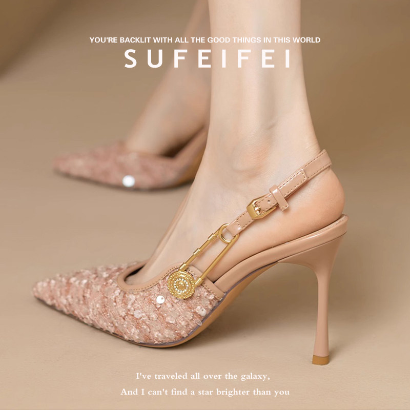 苏妃妃春季新款尖头绝美高跟鞋女细跟亮片包头后空凉鞋一字扣单鞋
