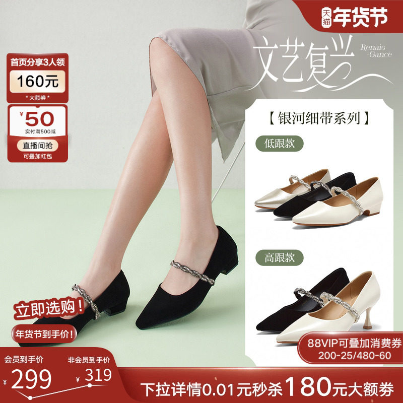 达芙妮粗跟高跟鞋女2026新款春秋方头浅口单鞋法式水钻方扣晚晚鞋