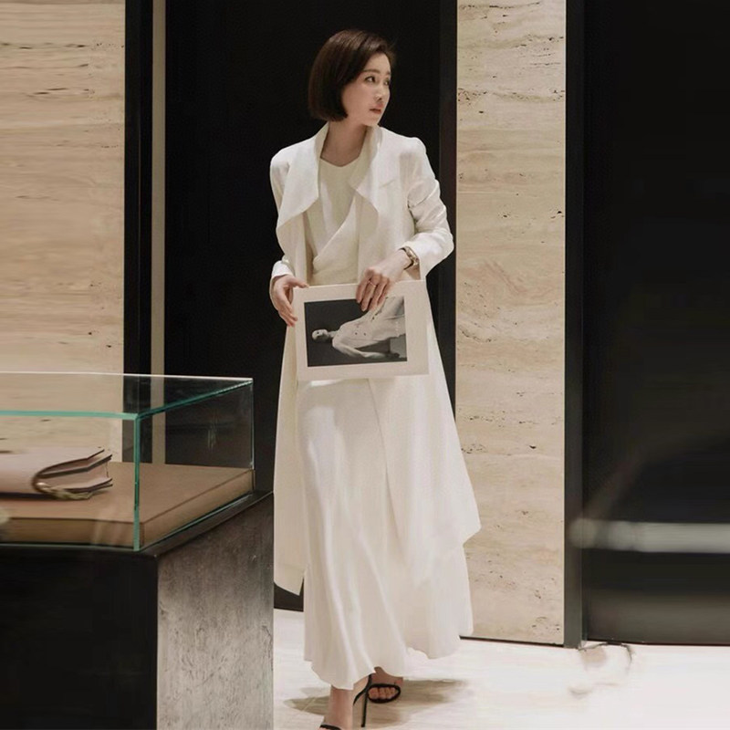 韩系白色风衣女款2025秋季新款英伦风翻领系腰带中长款外套大衣女