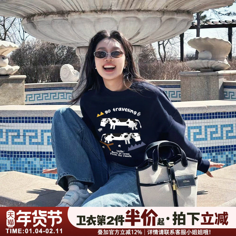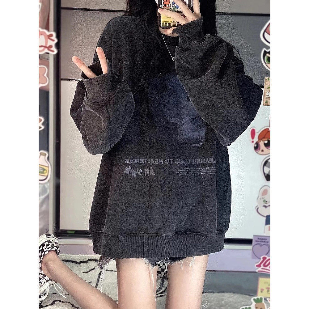 网红爆款2025秋冬正流行做旧水洗黑色圆领卫衣女宽松超显白上衣潮