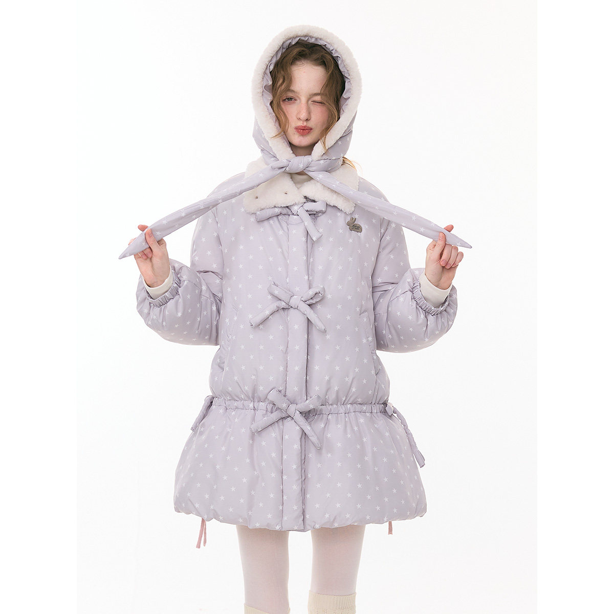 ziziFei''泡芙星心诗''秋冬灰色星星波点蝴蝶结中长款棉服外套女