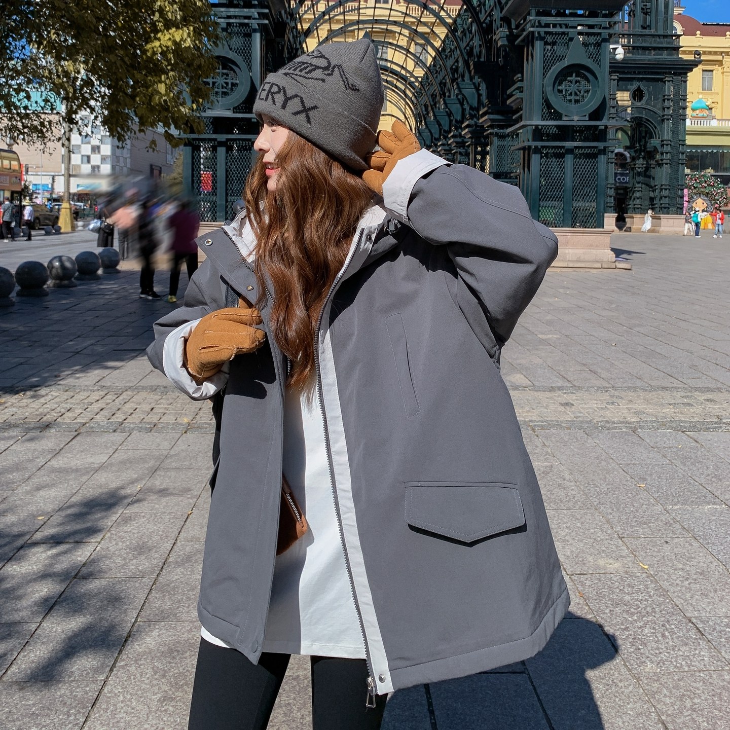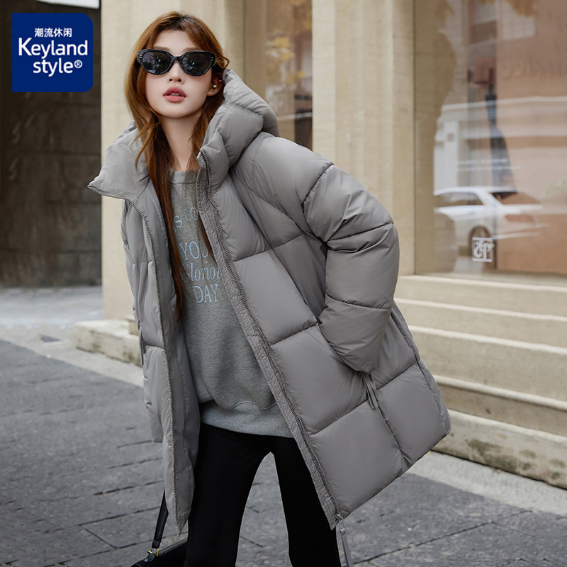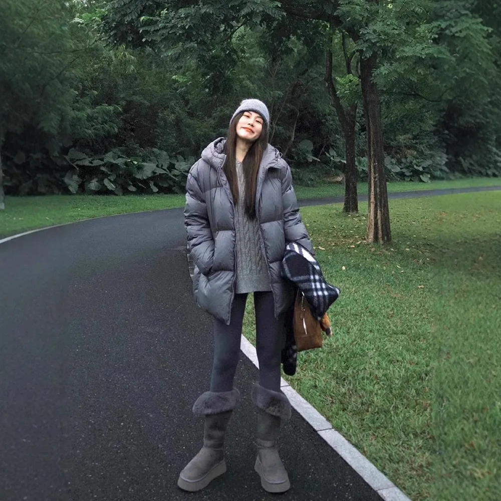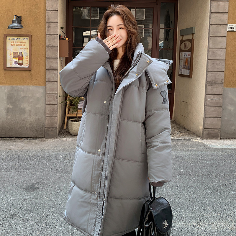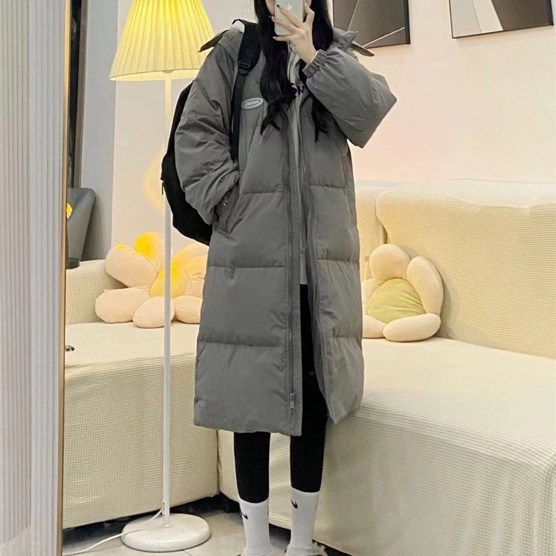 冬季慵懒风穿搭灰色羽绒棉服女中长款过膝宽松加厚连帽棉衣棉袄潮