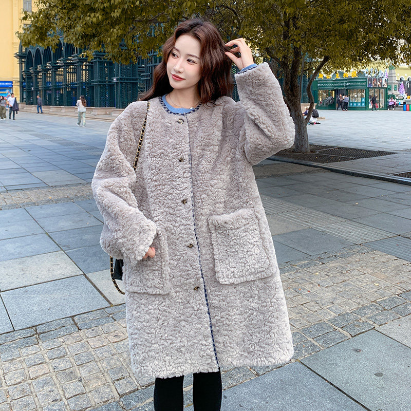 灰色中长款皮毛一体羊羔毛厚外套女秋冬超火好看加绒派克棉服大衣
