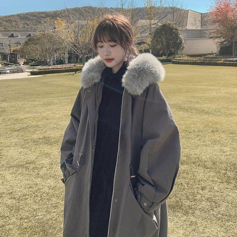 - 大毛领棉衣中长款韩版
