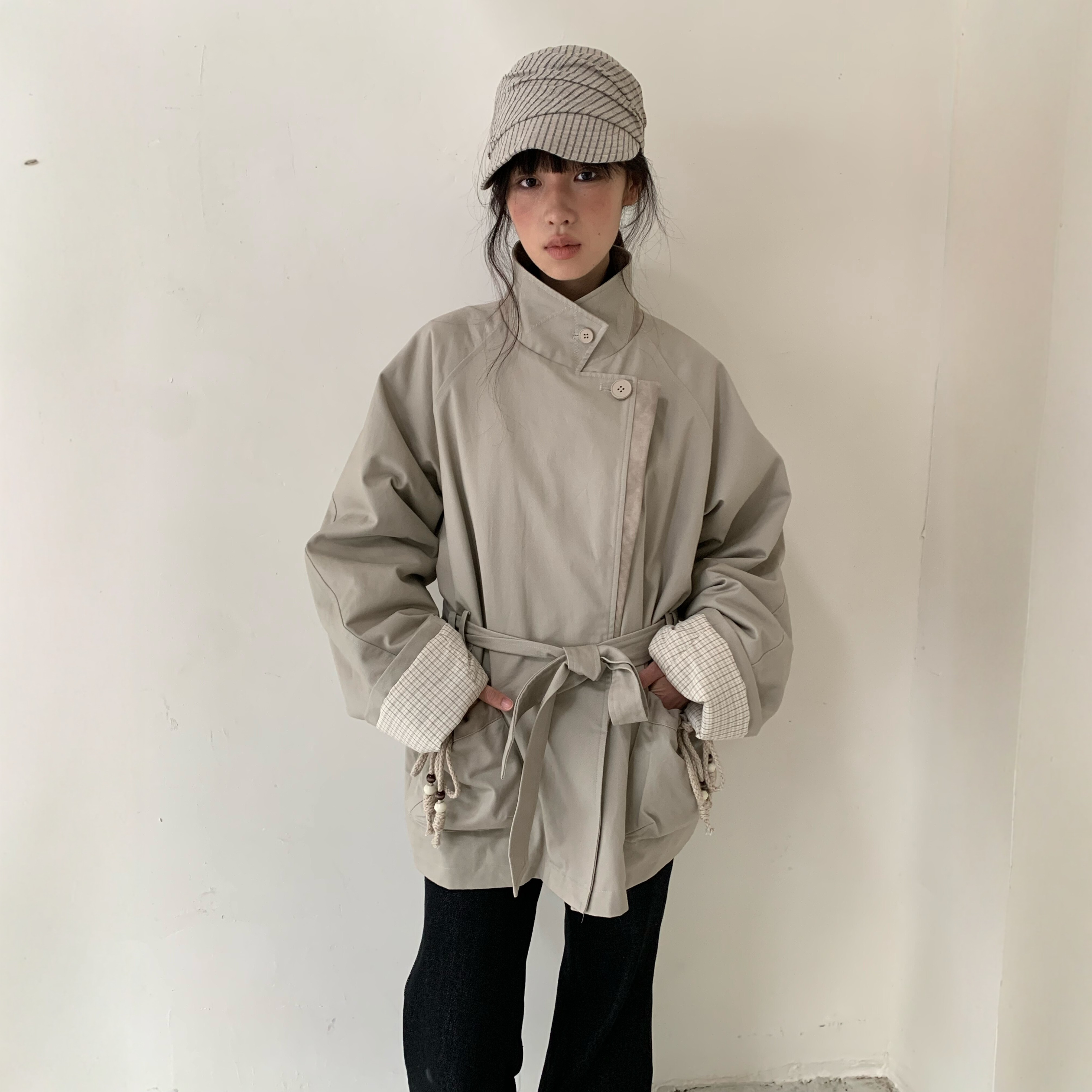dorydory 立领中长款棉服外套女2025秋冬新款米灰色收腰显瘦风衣