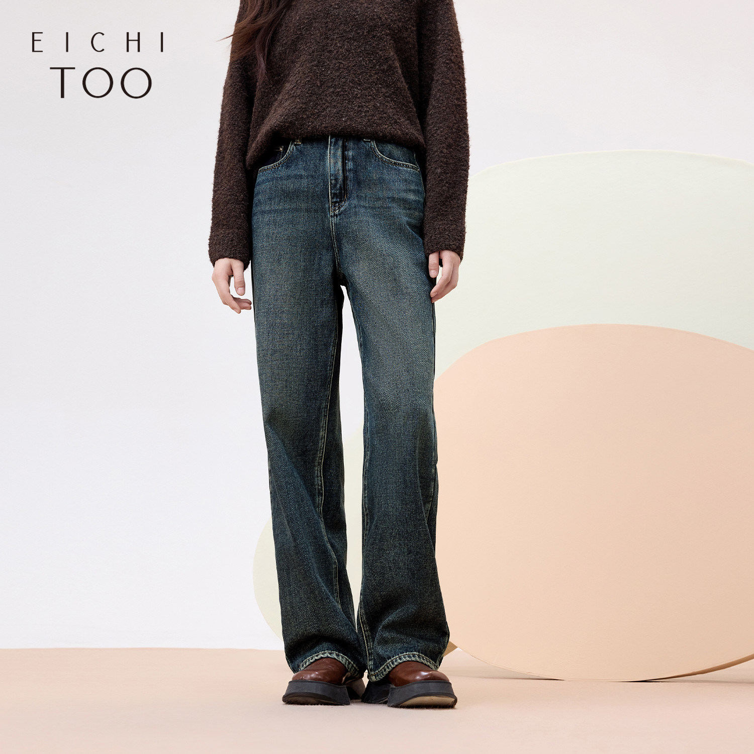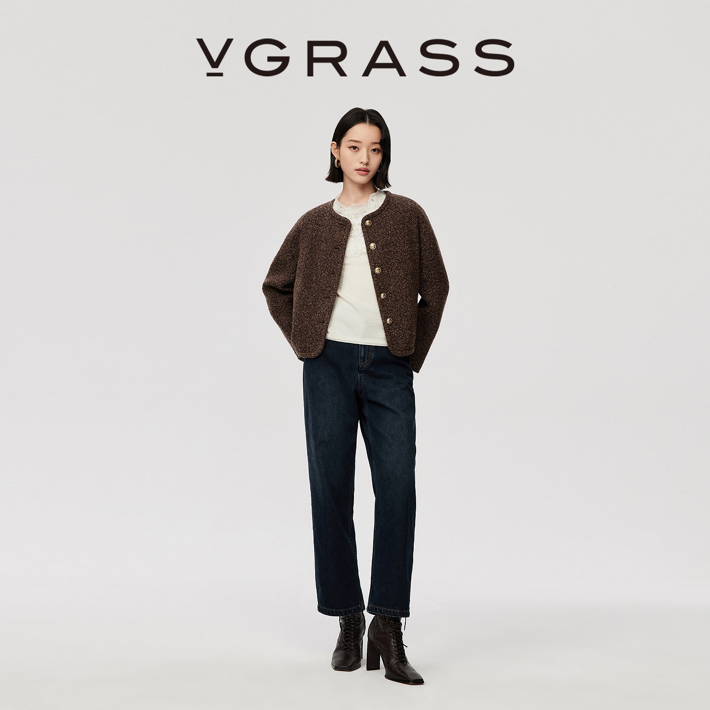VGRASS25冬季新款复古百搭显瘦直筒裤时髦深蓝棉混纺磨毛牛仔裤女