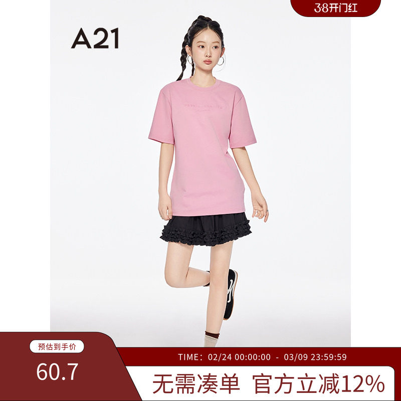 A21女装四色可选字母中长款棉T恤2025夏季新款简约圆领落肩袖上衣