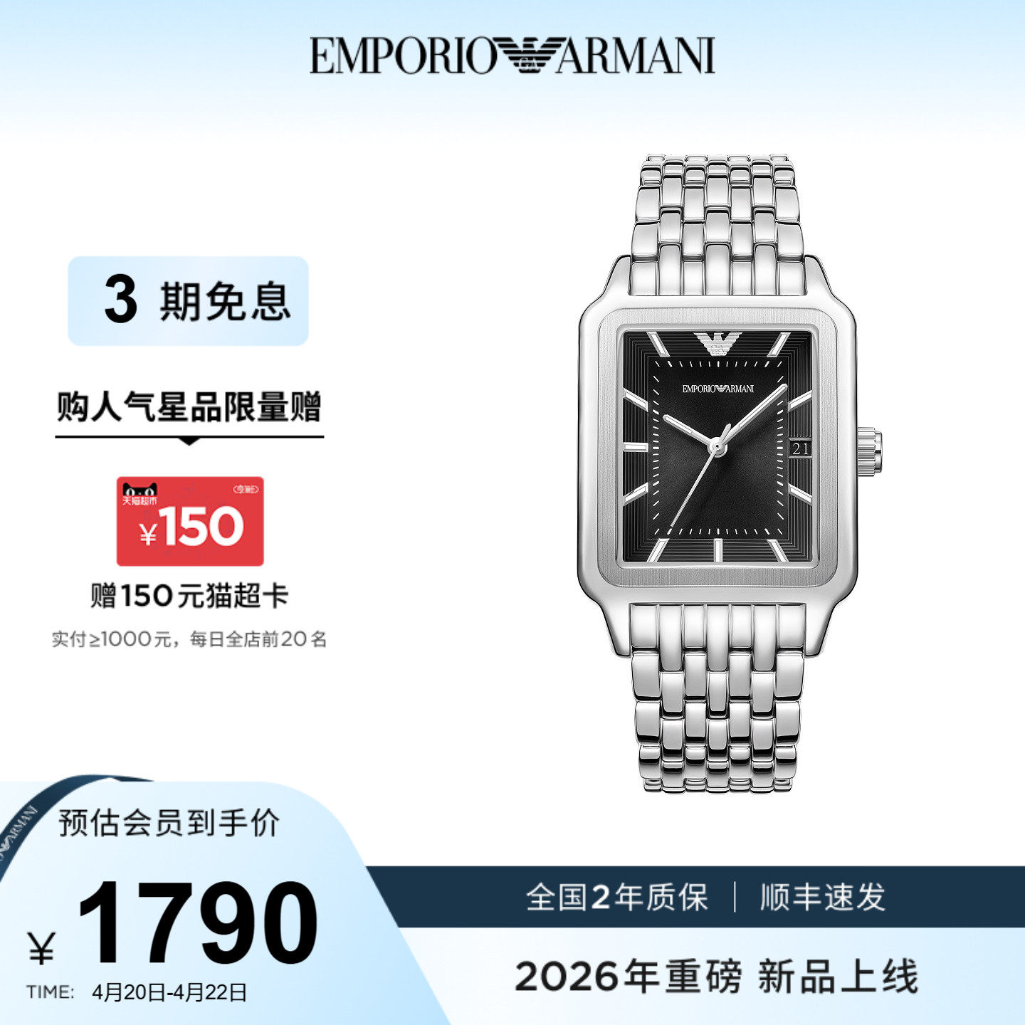 【春季新品】Armani阿玛尼白月光女士简约时尚方形石英表AR11742