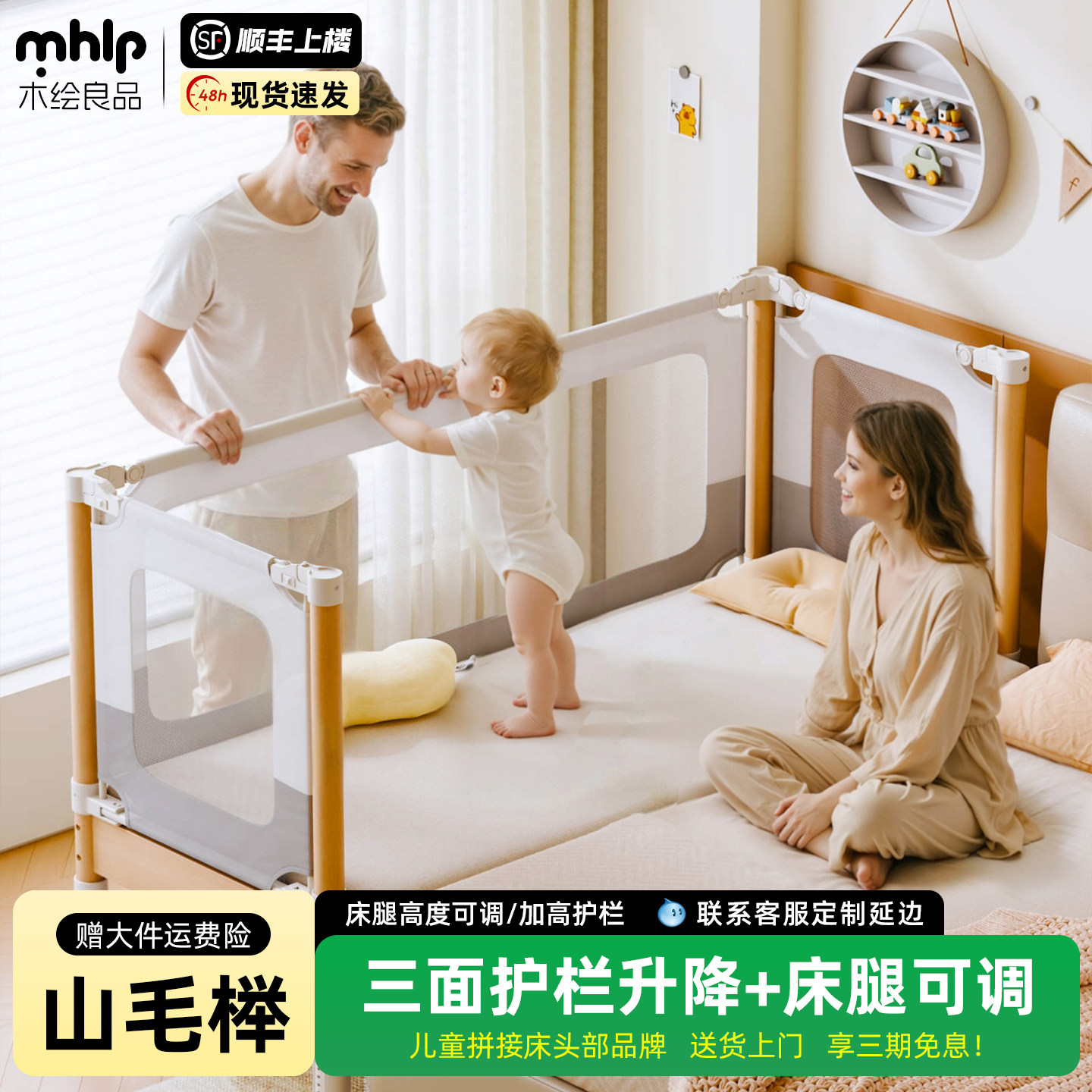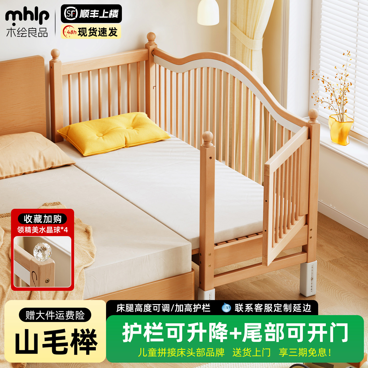 政府补贴榉木儿童拼接床婴儿实木加宽床可定制护栏升降围栏宝宝床
