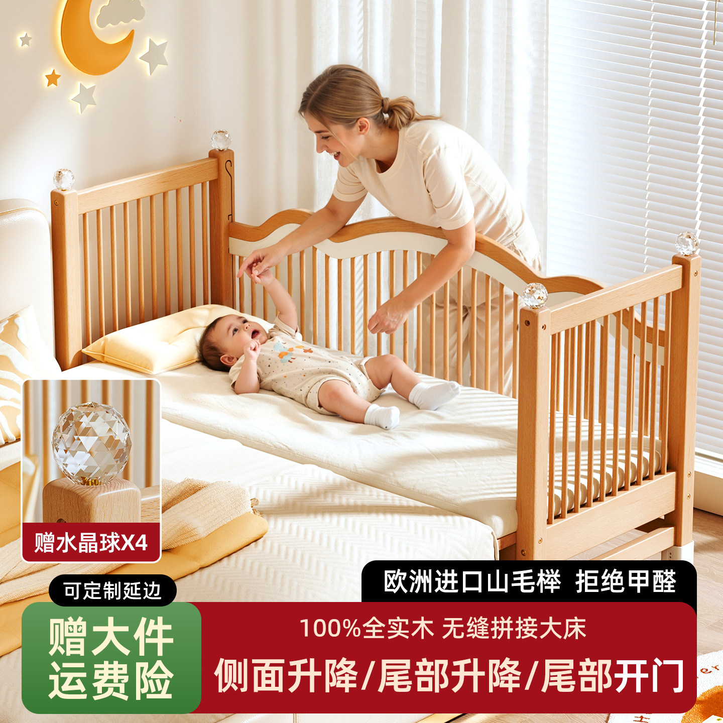 榉木升降拼接床实木宝宝小床拼接大床婴儿大人可睡儿童加宽床边床