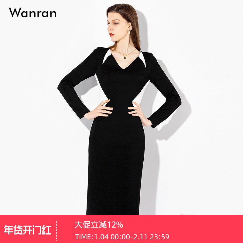 2026春装新款黑白气质V领视觉显瘦收腰拼接针织连衣裙职业中长款