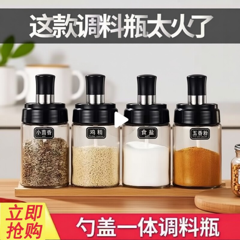 调味罐家用厨房用品勺盖一体玻璃调料盒盐罐味精酱油醋瓶组合套装
