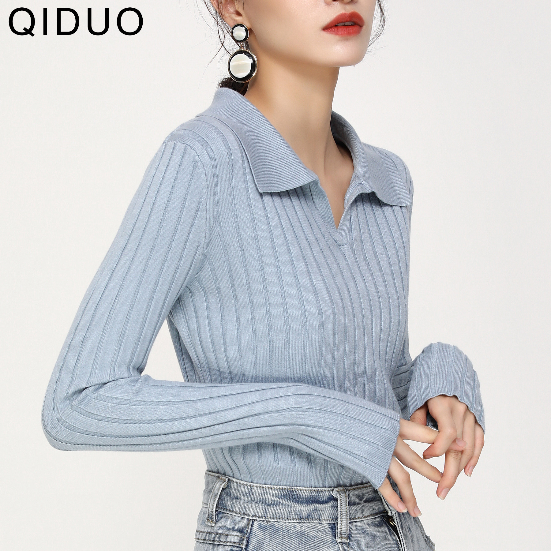 周雨彤同款秋冬新款V领长袖套头POLO领百搭打底针织衫针织毛衣女
