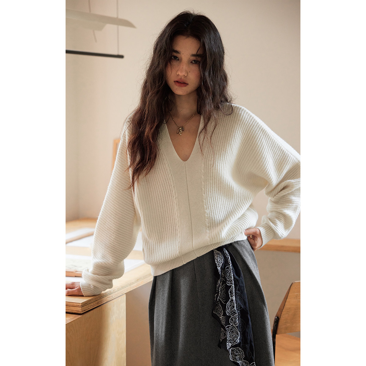秋冬季V领蚕丝山羊绒衫女宽松慵懒毛衣针织衫长袖套头无缝打底衫