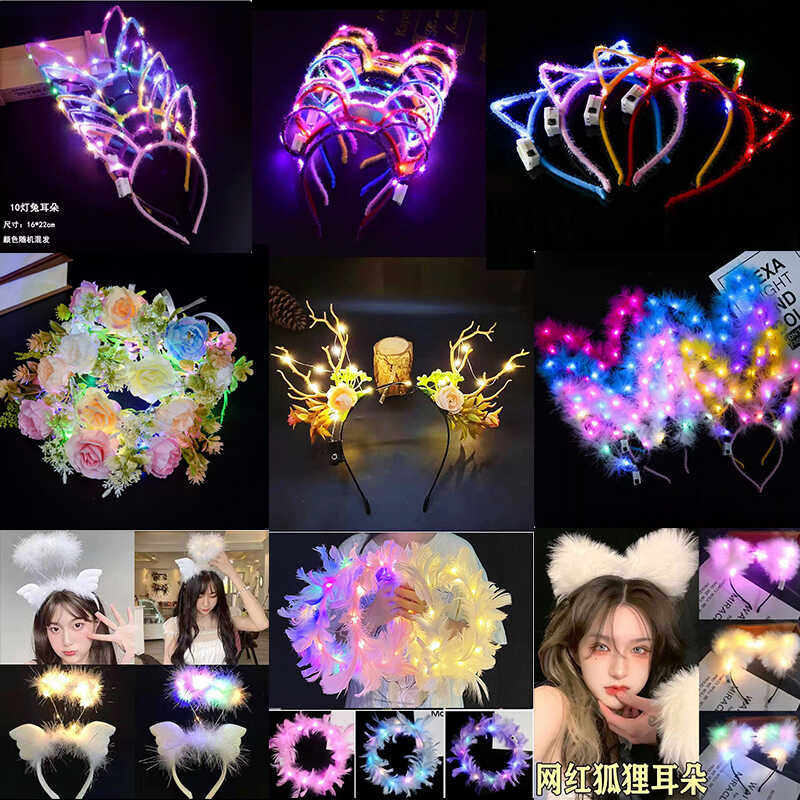 2026款夜市发光头饰带灯牛角发箍鹿角头箍羽毛兔子耳朵发卡蝴蝶结