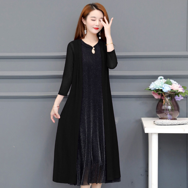 镂空提花中长款外搭开衫高级感2024新款女气质纯色连衣裙两件套