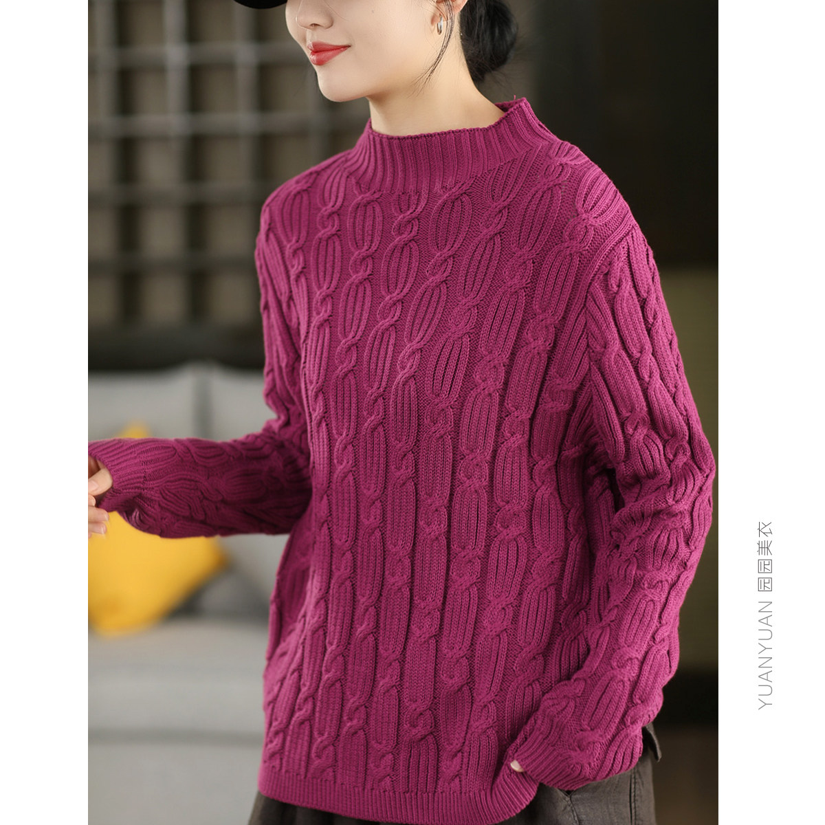 园园美衣新款复古棉线针织毛衣女时尚卷边套头衫长袖宽松纯色上衣