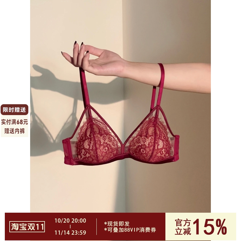 红色本命年三角杯内衣女蕾丝舒适薄款无钢圈性感纯欲小胸文胸套装