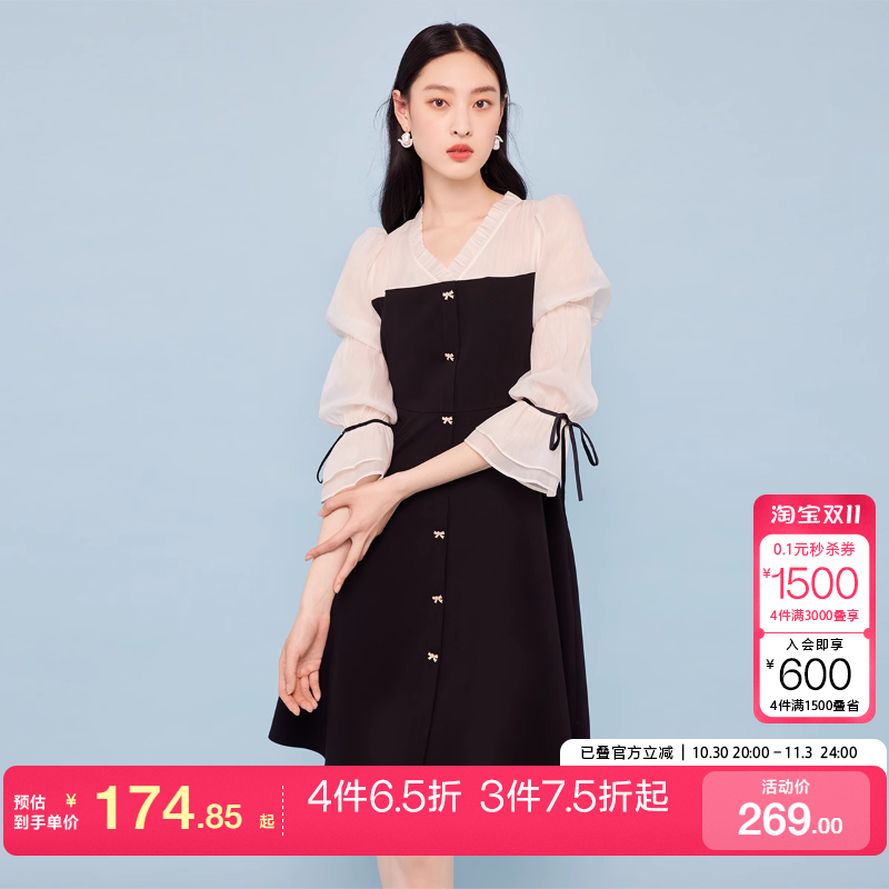 tq区绫致Vero Moda秋冬公主风V领雪纺泡泡袖拼接连衣裙时尚潮