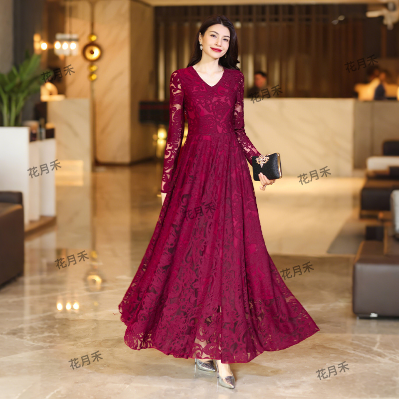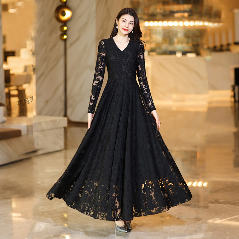 2025年新款春秋冬优雅气质长袖剪花大摆连衣裙长裙雪纺裙沙滩裙子